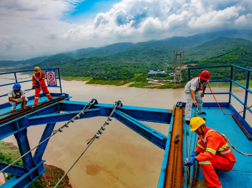 新田大橋建造時間緊、任務重,在確保質量的前提下,施工人員在不斷的搶時間、趕進度。大橋建造過程中施工人員佩戴防墜器、安全帶、安全繩等個人保護裝備,攀爬到177米的主墩頂部安裝卷揚機,為牽引索安裝做準備。難度最大的要數鋼箱梁吊裝作業,由于江流湍急、船舶定位難、臨江陡崖地帶復雜、長距離蕩移險等困難,項目建設團隊采用跨纜吊機+長吊索蕩移先進技術,配合手拉葫蘆、卸扣、起重滑車、卷揚機等工具,歷經四個月順利完成鋼箱梁吊裝安裝作業,為后期施工爭取寶貴的時間。